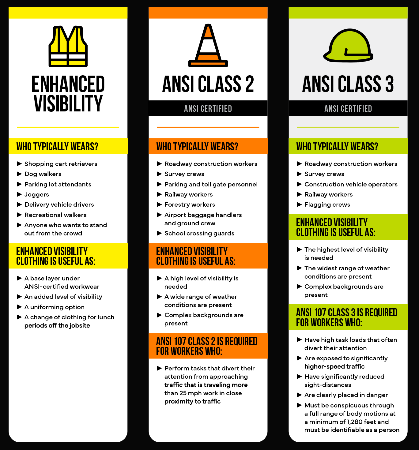Safety standards are divided into classes based on the level of risk and the environment of the jobsite.